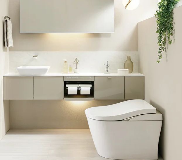 โถสุขภัณฑ์ (Toilet): ควรเลือกแบบ ชิ้นเดียว (One-Piece) ที่มีรูปทรงโค้งมนหรือเหลี่ยมที่เรียบง่าย เพราะไม่มีรอยต่อ ทำให้ทำความสะอาดง่ายและดูคลีน หรือเลือกแบบ แขวนผนัง (Wall-Hung) เพื่อซ่อนถังพักน้ำและเผยให้เห็นพื้นที่พื้นห้องน้ำ ทำให้ห้องดูกว้างและโปร่งขึ้น